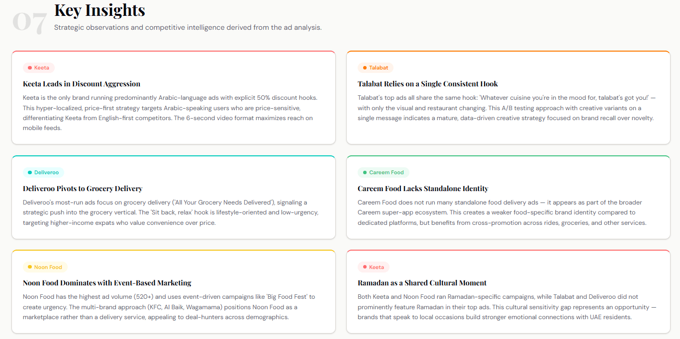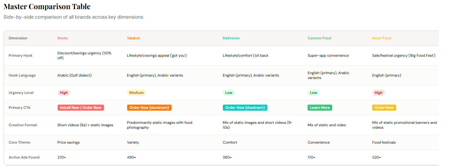 Manus AI revealed distinct strategies among the top five delivery players: Market Leader (Volume): Noon Food dominates with 520+ active ads, focusing on event-based marketing like the 'Big Food Fest.' Market Entry Strategy: Keeta utilizes the 'Install Now' CTA in ~80% of its creative, prioritizing user acquisition over immediate orders. Strategic Pivot: Deliveroo has shifted its focus toward grocery delivery ('All Your Grocery Needs Delivered') to capture the high-income expat demographic.