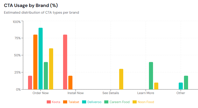 Helps you understand where each player is in the market. Keeta, being the newest entrant in the UAE market, has ~80% of its ads with the ‘Install Now’ CTA while others are focusing on ‘Order Now’ as they’d have a much higher existing customer base.