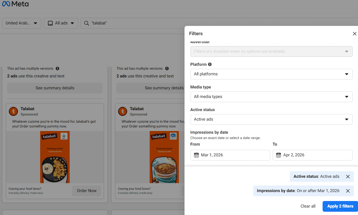 Go to the Meta Ad Library, search for these brands in the UAE, and analyze their top 5 active ads. Create a detailed table comparing their hooks, CTAs, and creative formats