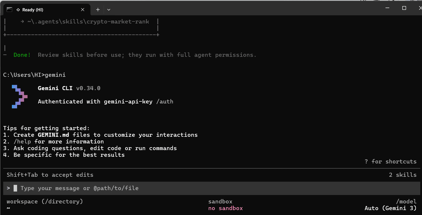 Once you paste your Gemini API key, your Gemini CLI should look like this.