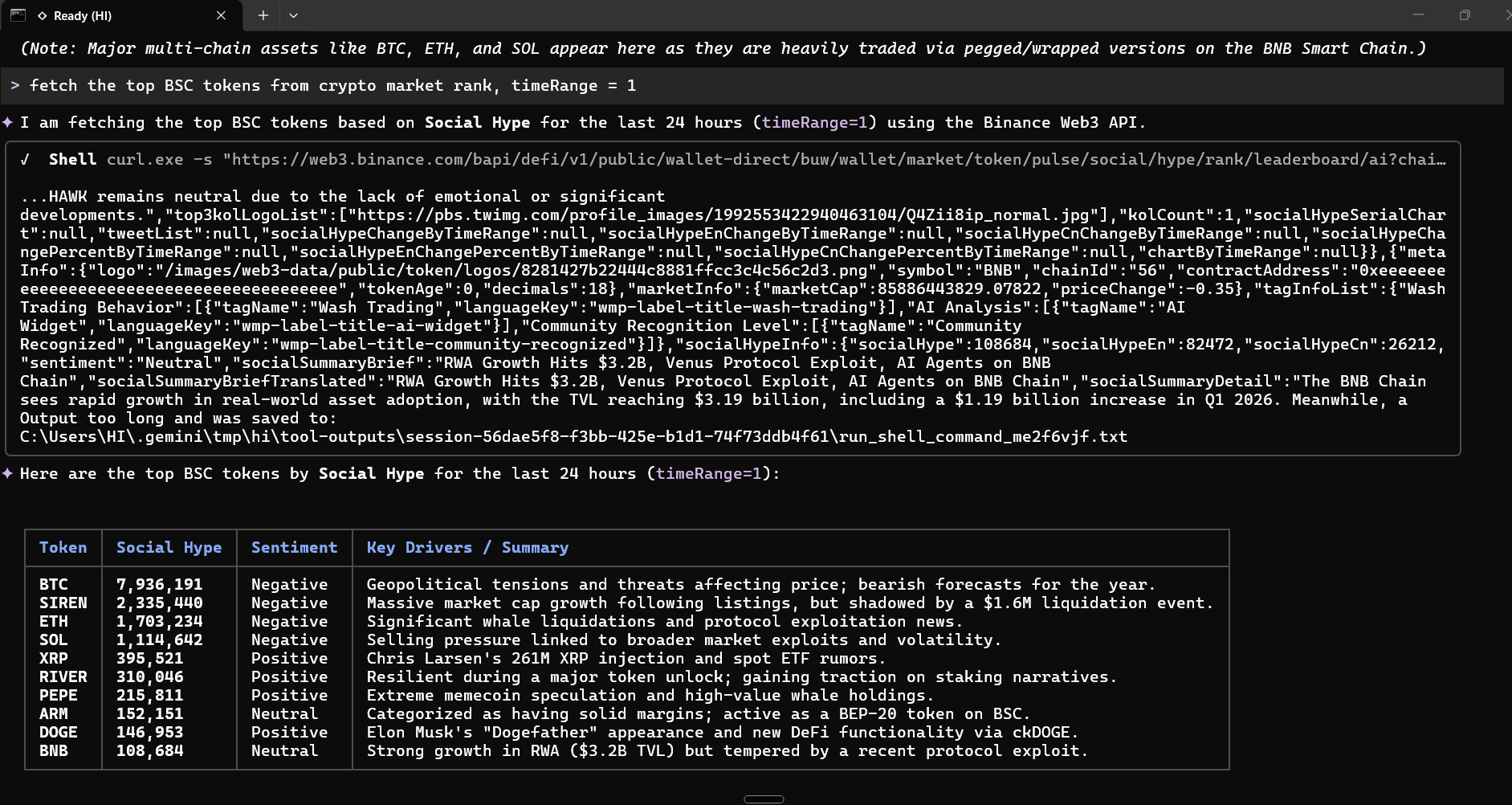 Hence, our command in Gemini CLI will include BSC (as chain is required, also BSC, Base, Solana are available right now) and timeRange = 1