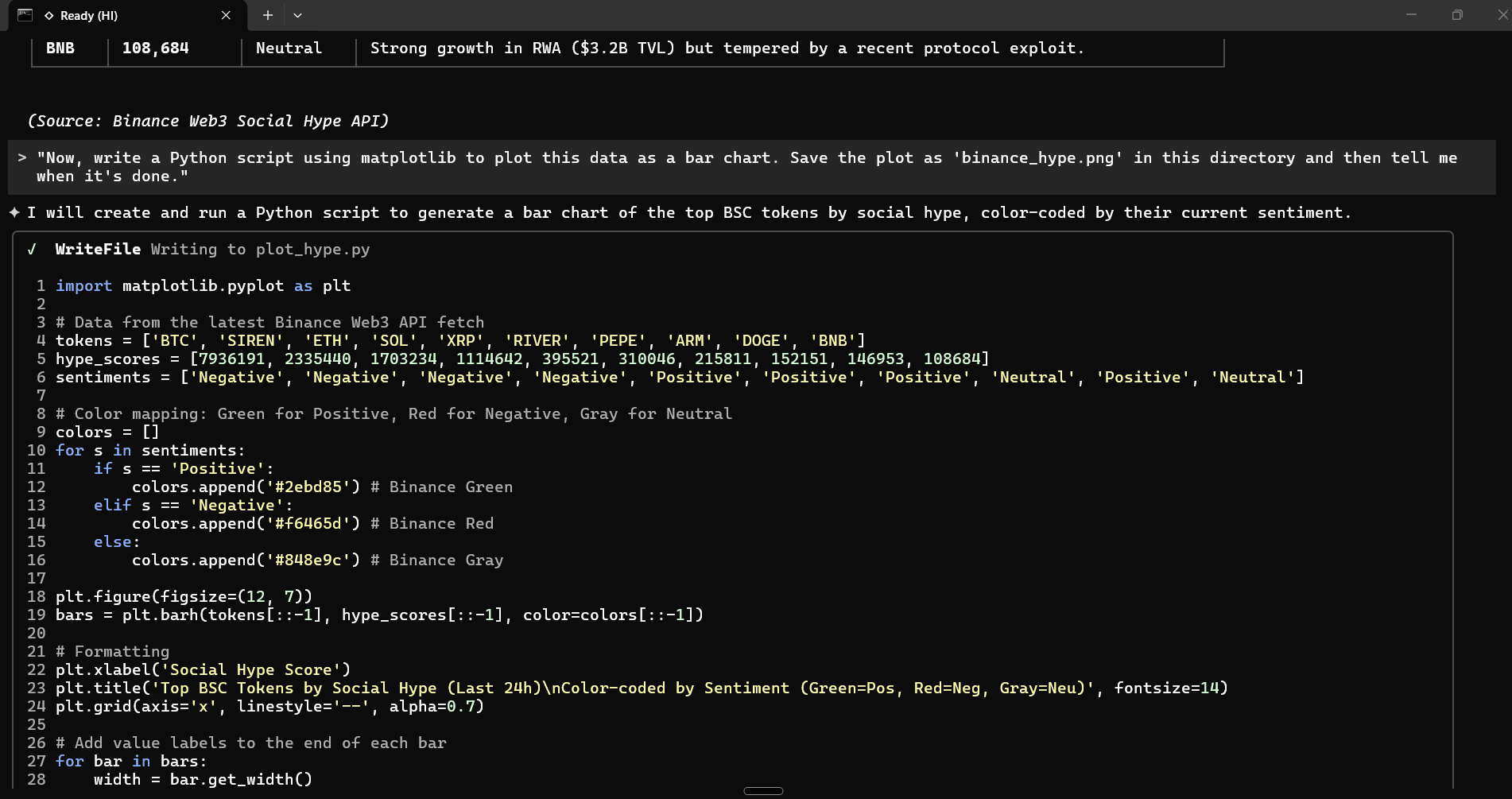 While the CLI delivers on the data, it’s not the prettiest of visualizations. Therefore, we will run a prompt to convert this into a Python plot and save the image as ‘binance_hype.png’