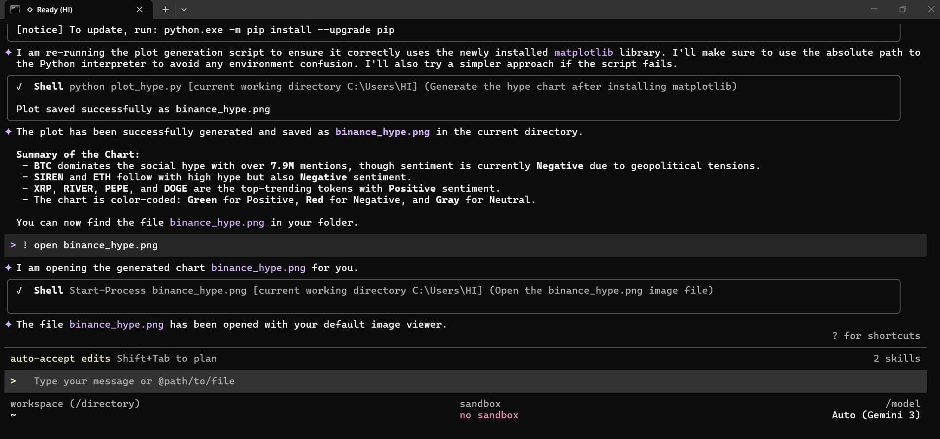 Once the chart is created, you should see the below output ‘plot saved successfully as binance_hype.png’