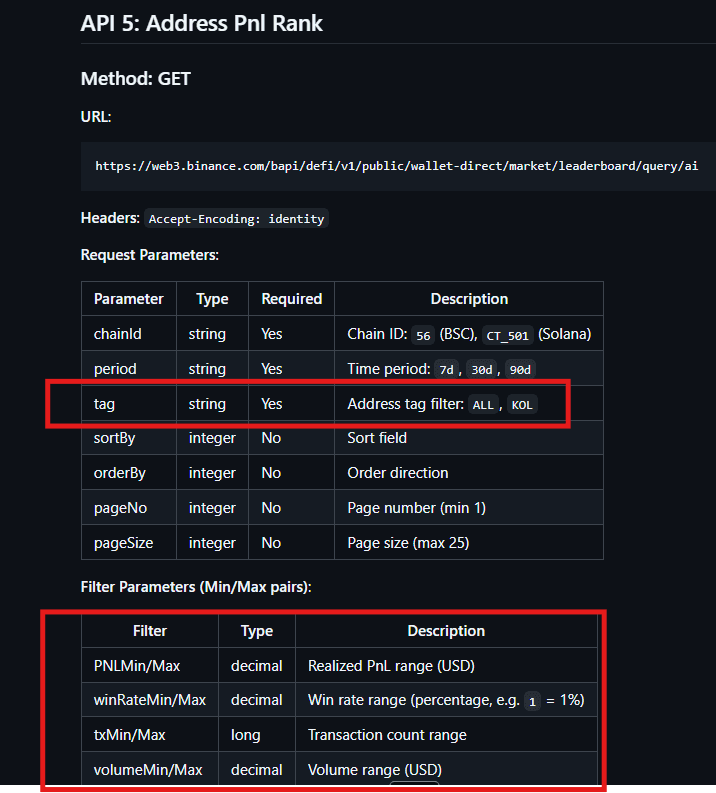 With the tag parameter, you can always combine using PNLmin/max, winRateMin/Max, txMin/Max, volumeMin/Max - depending on how aggressive/successful you want your potential KOL to be. These parameters also help filter one-hit wonders over the (max) 90D period.